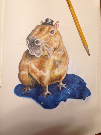 Clarissa Baut Stetson, “Capybara with hat” concept sketch for The Menagerie Gaming as Women (play report): “A brief note on the book: it is absolutely gorgeous. The illustrations are high-contrast, ink line drawings provided by Thore Hansen and Kathy Schad. (…) We found it was always fun to pull the cards. They introduce unexpected results and energize play.”